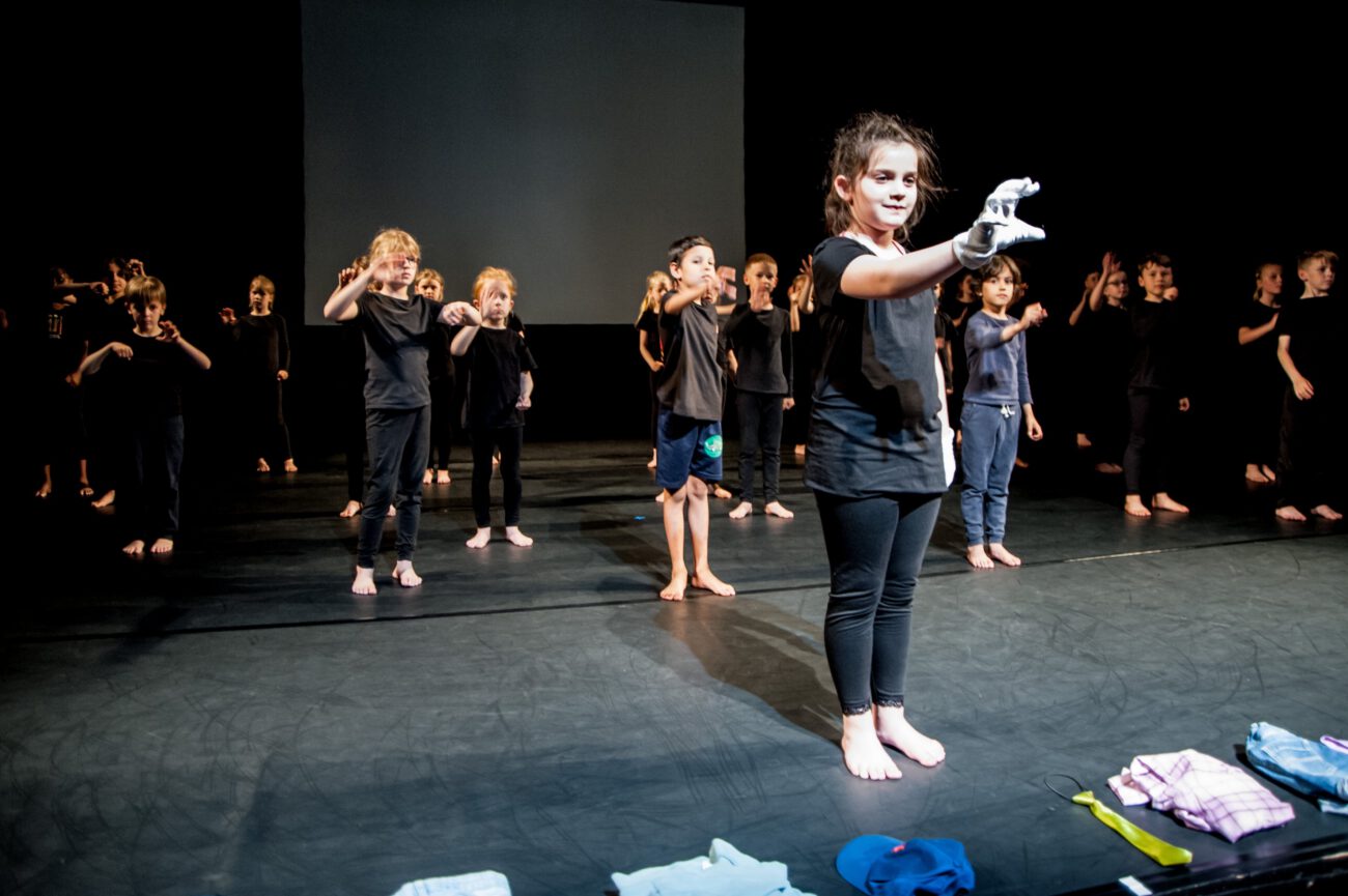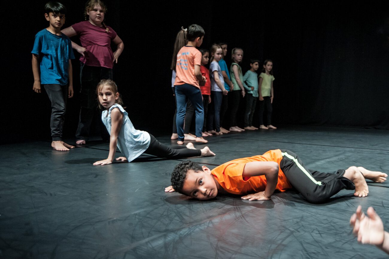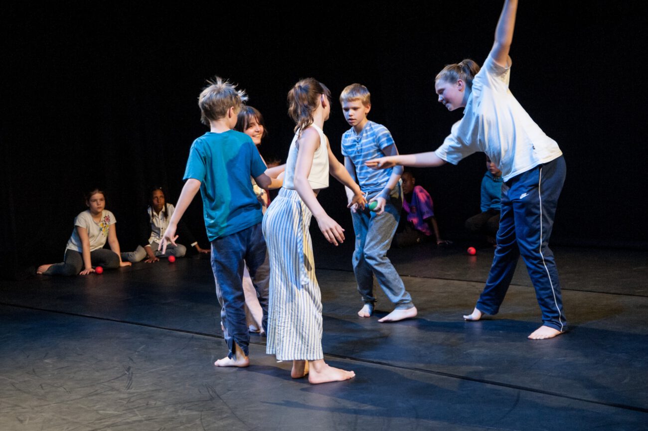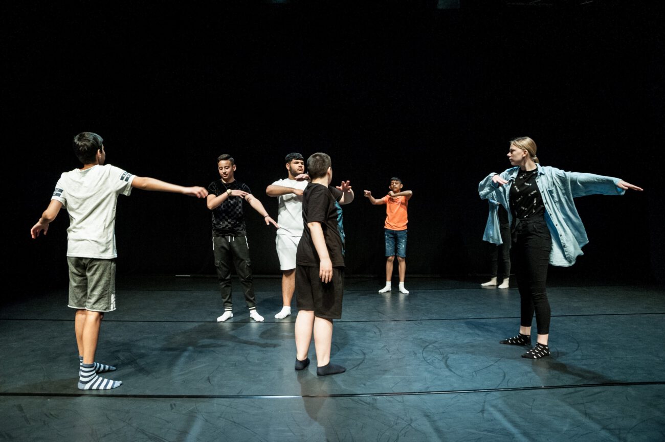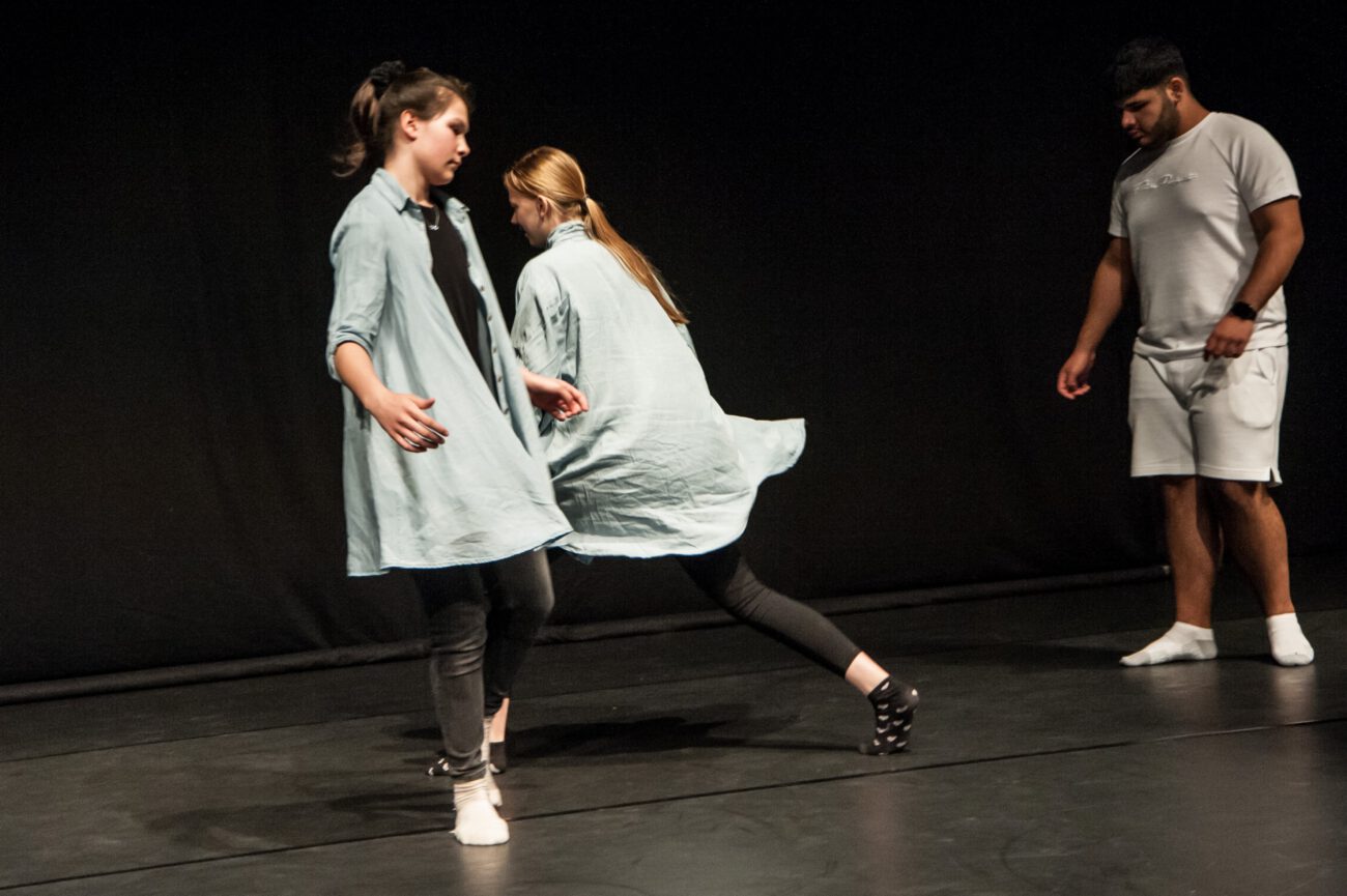 Dabei überlegten sie gemeinsam: Gibt es eine spezifische Bewegungssprache oder Bewegungsprinzipien? Eine besondere Arbeitsweise? Was sind choreografische Themen des jeweiligen Vorbilds? Außerdem haben sich die Künstler*innen und Schüler*innen mit dem theatralen Raum beschäftigt: Wie lässt er sich mit einfachen Mitteln über Requisiten, Bühnenelemente o.ä. gestalten?