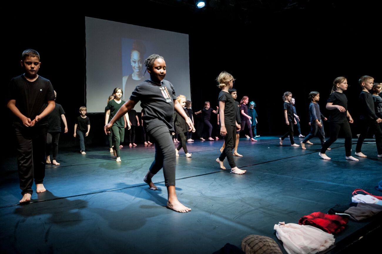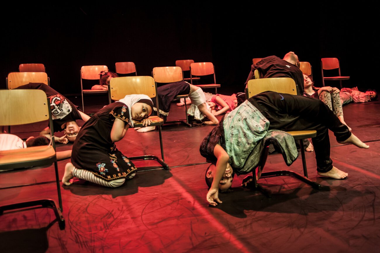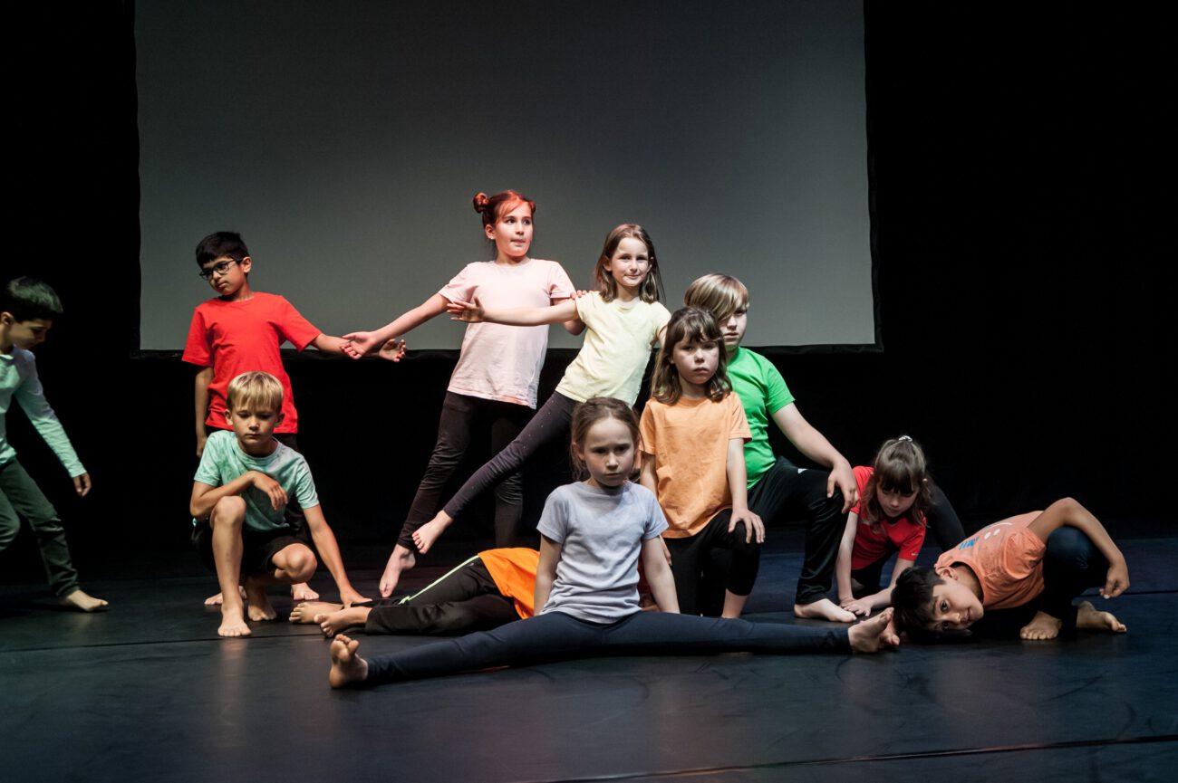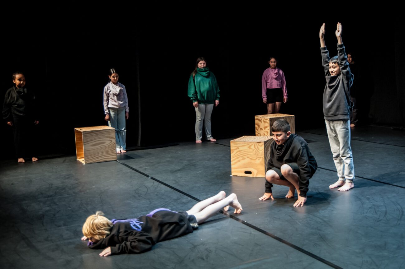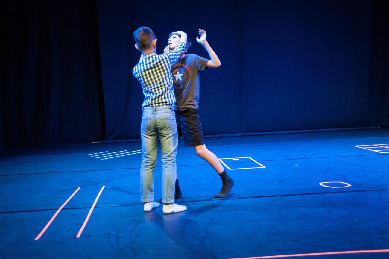 Dabei überlegten sie gemeinsam: Gibt es eine spezifische Bewegungssprache oder Bewegungsprinzipien? Eine besondere Arbeitsweise? Was sind choreografische Themen des jeweiligen Vorbilds? Außerdem haben sich die Künstler*innen und Schüler*innen mit dem theatralen Raum beschäftigt: Wie lässt er sich mit einfachen Mitteln über Requisiten, Bühnenelemente o.ä. gestalten?