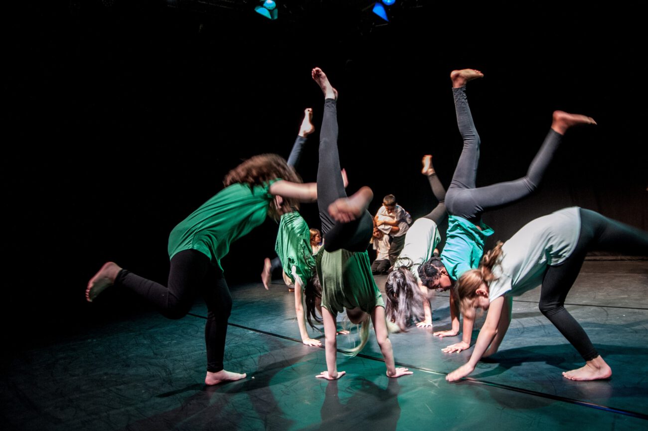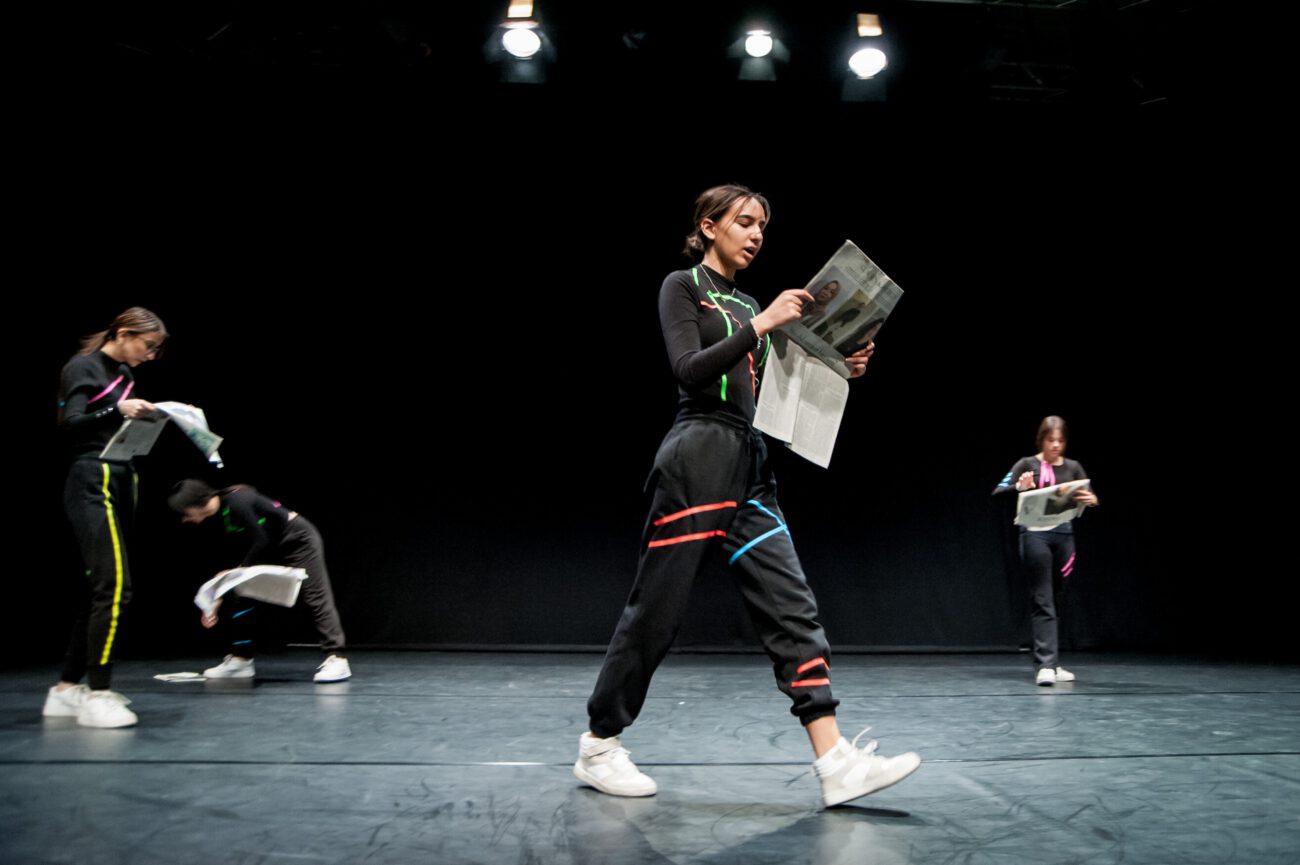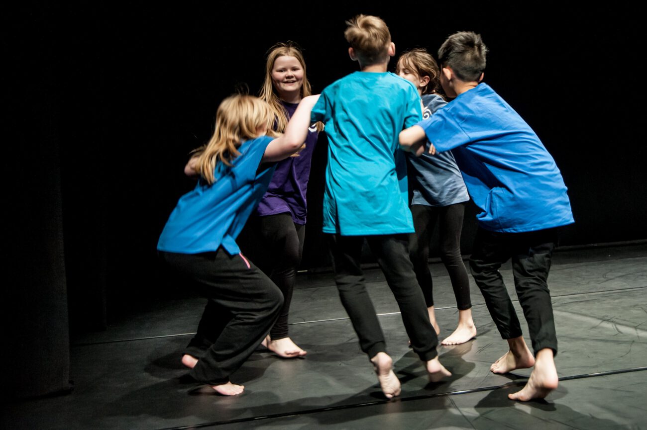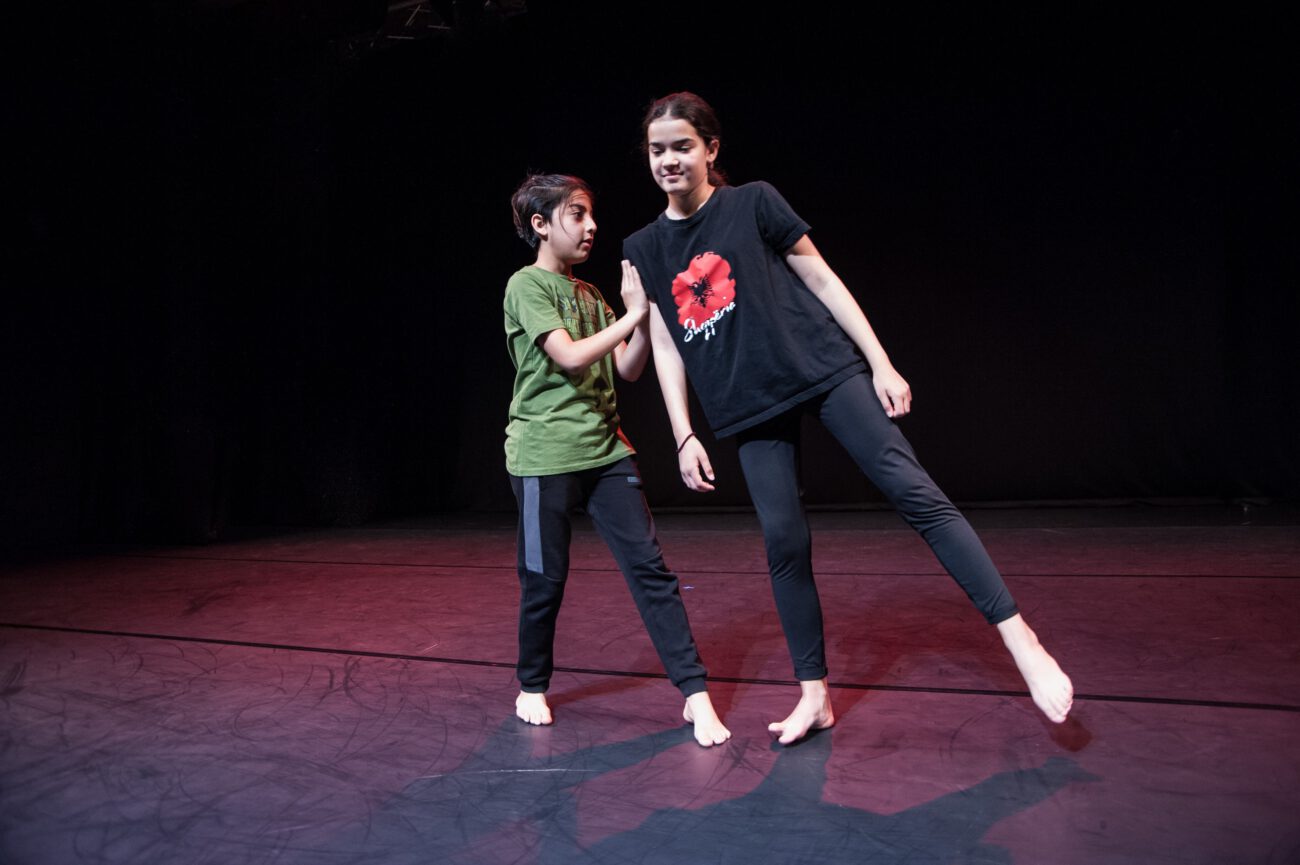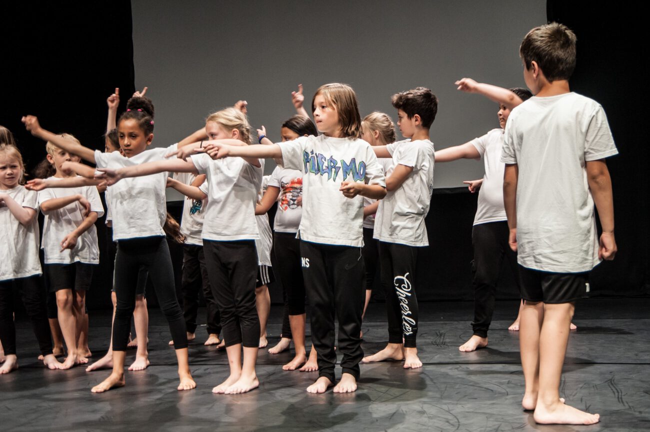 Dabei überlegten sie gemeinsam: Gibt es eine spezifische Bewegungssprache oder Bewegungsprinzipien? Eine besondere Arbeitsweise? Was sind choreografische Themen des jeweiligen Vorbilds? Außerdem haben sich die Künstler*innen und Schüler*innen mit dem theatralen Raum beschäftigt: Wie lässt er sich mit einfachen Mitteln über Requisiten, Bühnenelemente o.ä. gestalten?