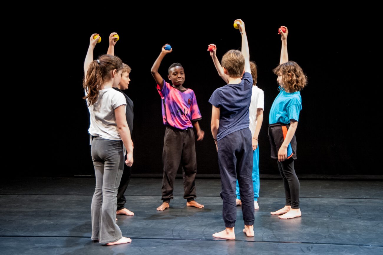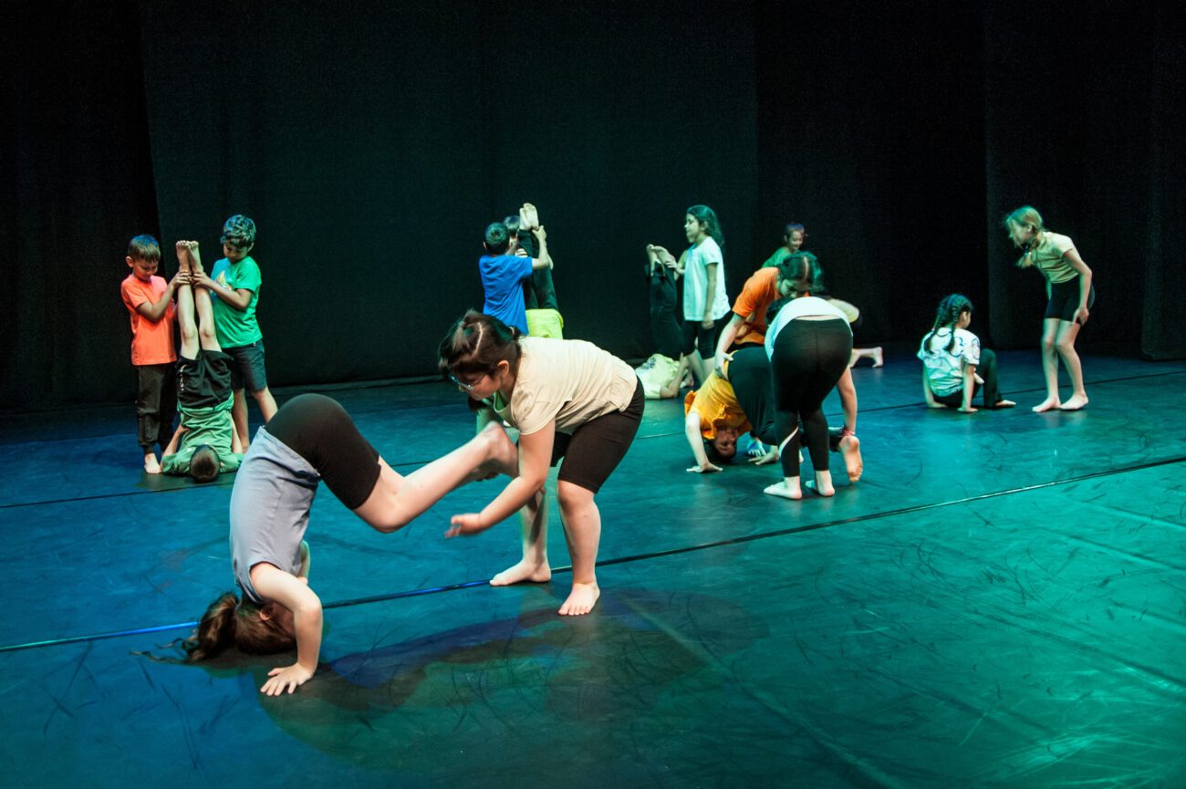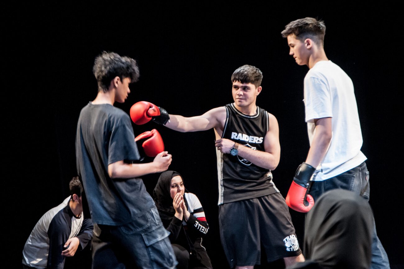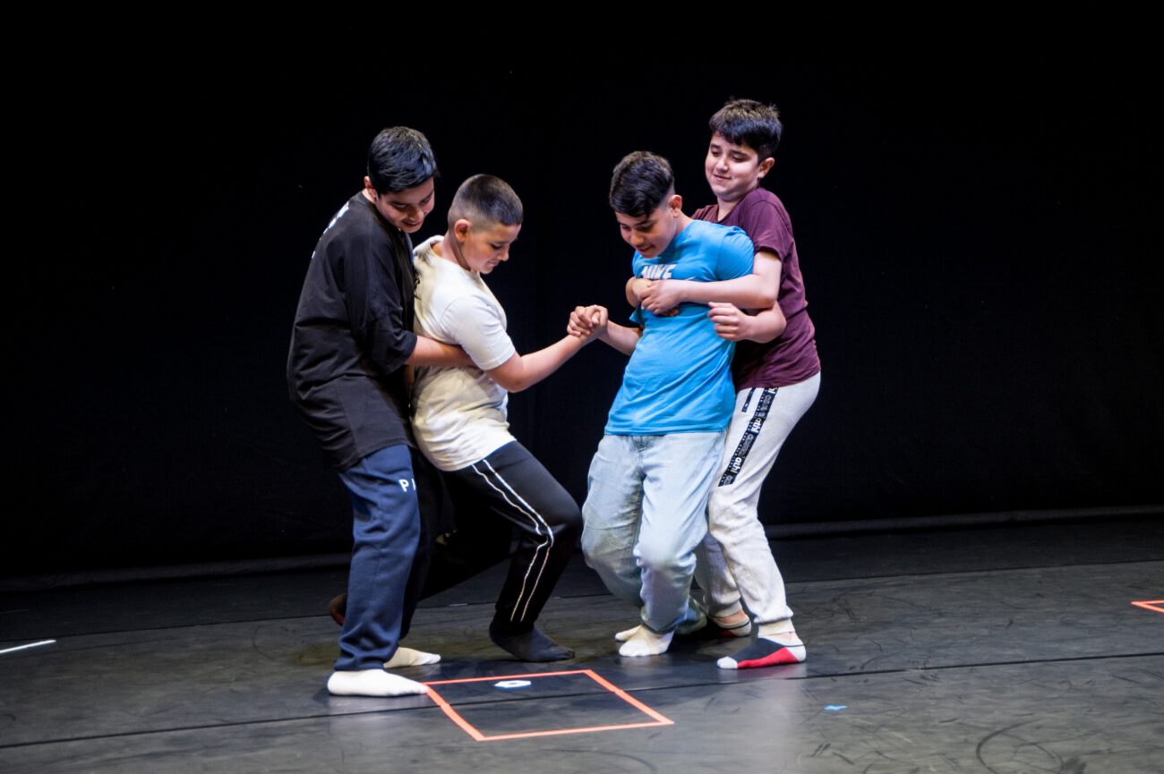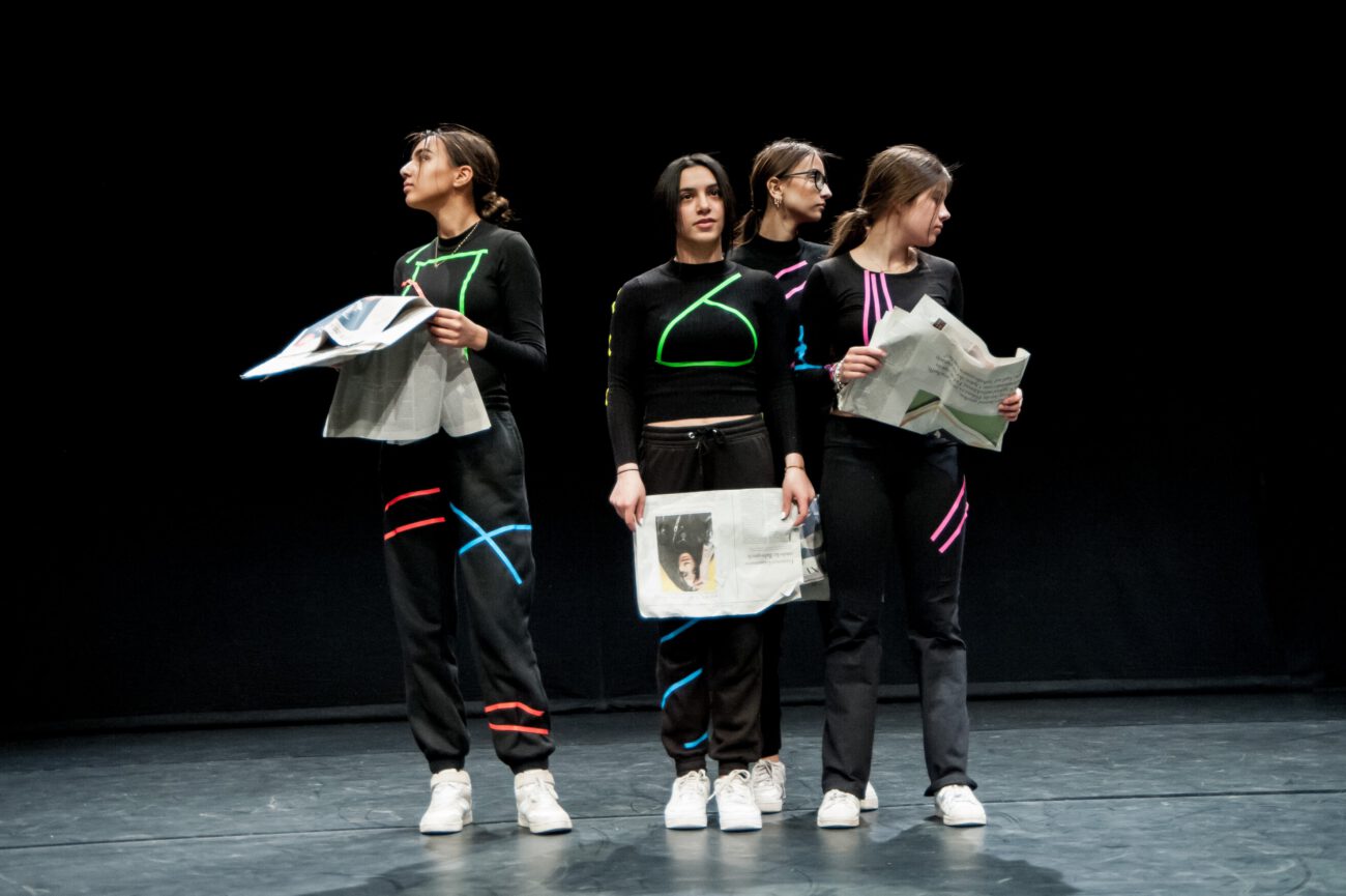Dabei überlegten sie gemeinsam: Gibt es eine spezifische Bewegungssprache oder Bewegungsprinzipien? Eine besondere Arbeitsweise? Was sind choreografische Themen des jeweiligen Vorbilds? Außerdem haben sich die Künstler*innen und Schüler*innen mit dem theatralen Raum beschäftigt: Wie lässt er sich mit einfachen Mitteln über Requisiten, Bühnenelemente o.ä. gestalten?