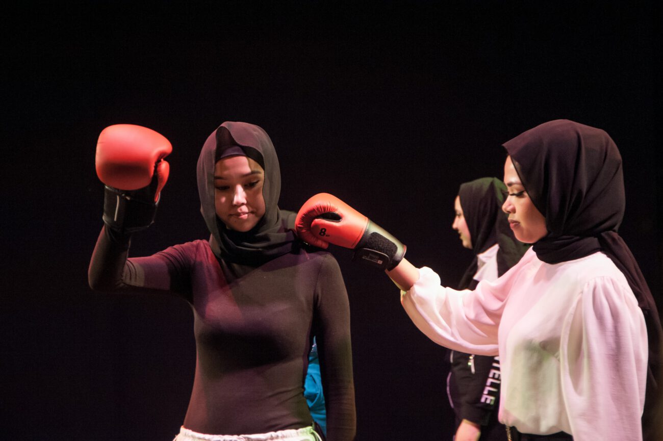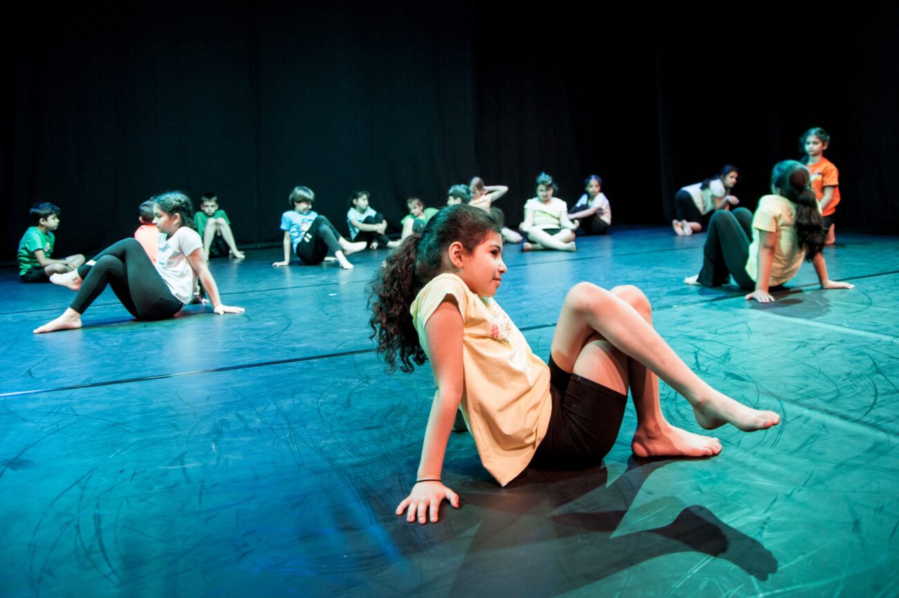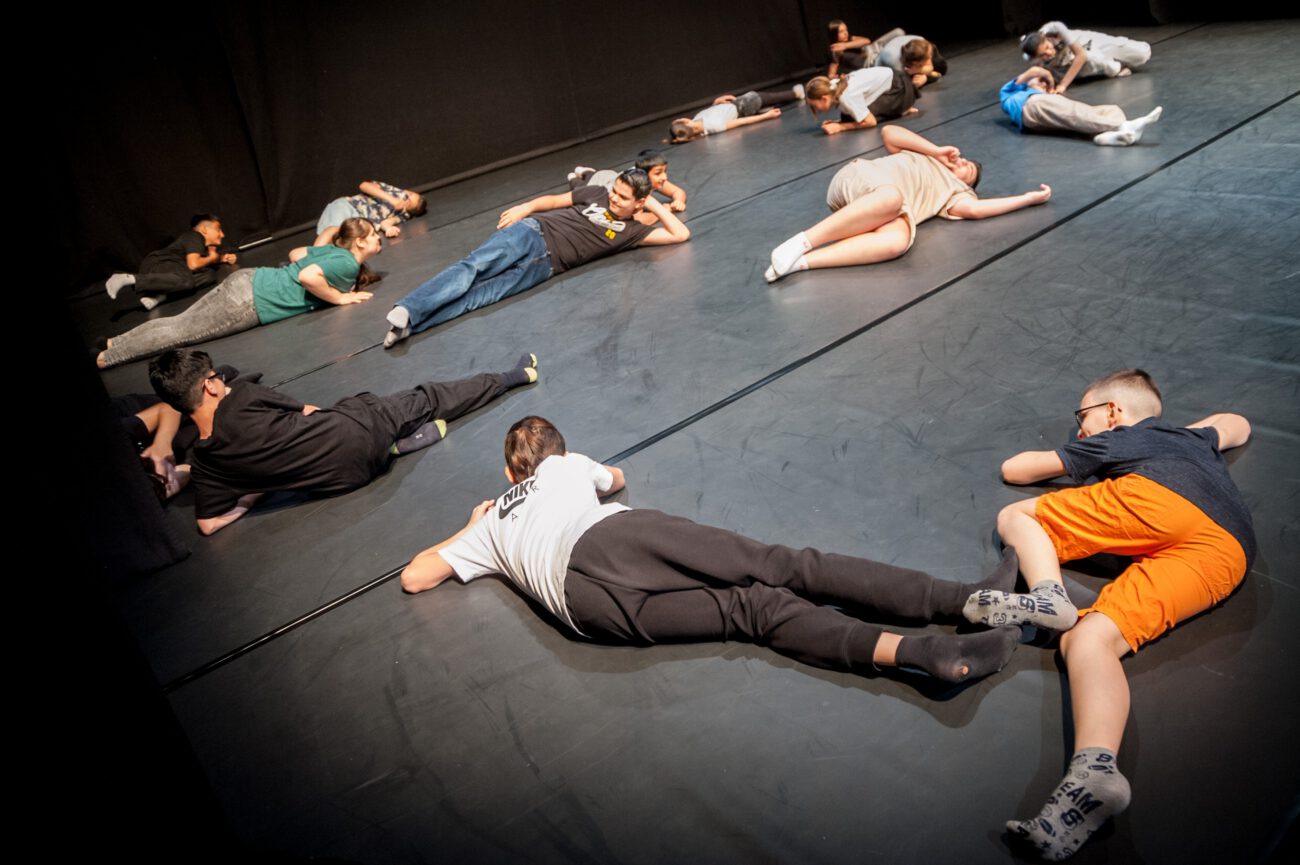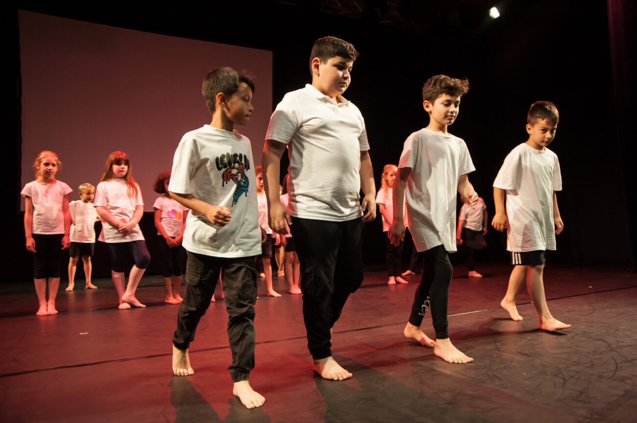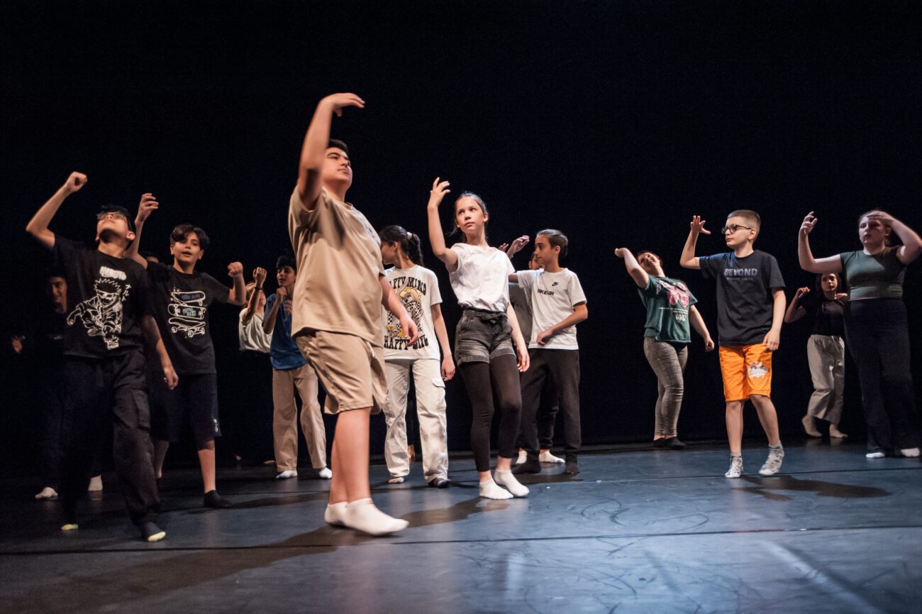 Dabei überlegten sie gemeinsam: Gibt es eine spezifische Bewegungssprache oder Bewegungsprinzipien? Eine besondere Arbeitsweise? Was sind choreografische Themen des jeweiligen Vorbilds? Außerdem haben sich die Künstler*innen und Schüler*innen mit dem theatralen Raum beschäftigt: Wie lässt er sich mit einfachen Mitteln über Requisiten, Bühnenelemente o.ä. gestalten?